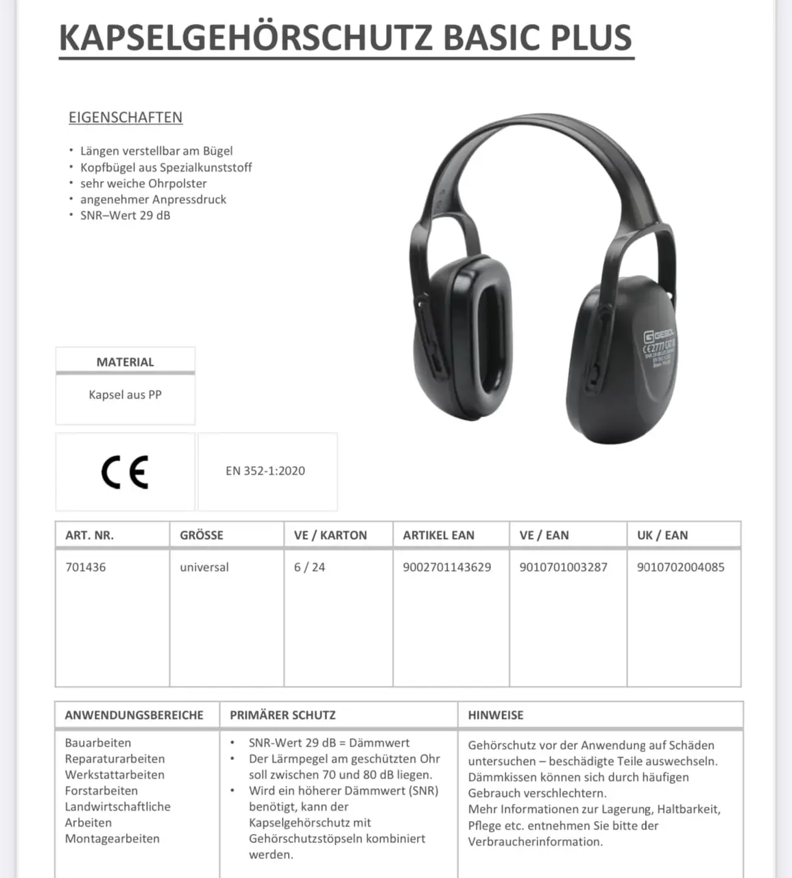 • Zaščita hrupa: SNR vrednost 29 dB, skladno s standardom EN 352‑1:2002 Glušniki so testirani po najvišjih standardih in so zanesljiva izbira za zaščito sluha.